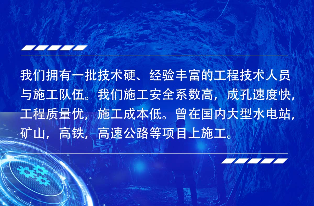 淮北市勤拓礦山工程有限公司是一家從事多年反井鉆機(jī)施工的服務(wù)生產(chǎn)型公司,公司目前有十幾臺鉆機(jī)設(shè)備,ZFY120/30/150型反井(天井)鉆機(jī)5臺,ZFY1.8/40/250型反井(天井)鉆機(jī)4臺,ZFY2.5/70/200型反井(天井)鉆機(jī)2臺,ZFY3.0/120/400型反井鉆機(jī)1臺,ZFY3.5/120/400型反井(天井)鉆機(jī)1臺,可承接深度0-300米,成孔直,0.9~4米.1.2~3米的各種豎井、井下煤倉、溜煤眼、通風(fēng)井、調(diào)壓井、電纜井、泄水井等。我們擁有一批技術(shù)硬、經(jīng)驗(yàn)豐富的工程技術(shù)人員與施工隊(duì)伍。我們施工安全系數(shù)高,成孔速度快,工程質(zhì)量優(yōu),施工成本低。曾在國內(nèi)大型水電站,礦山,高鐵,高速公路等項(xiàng)目上施工。